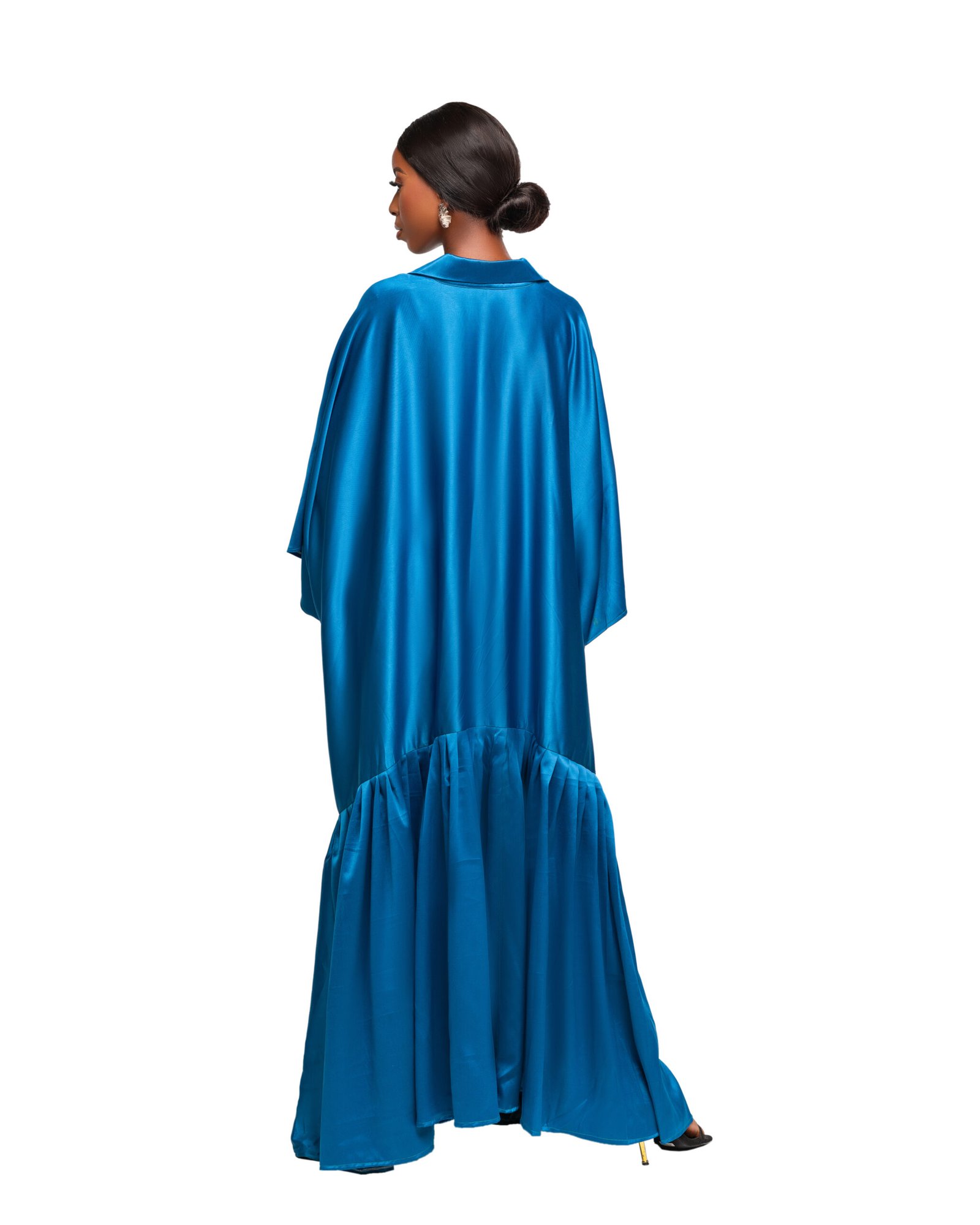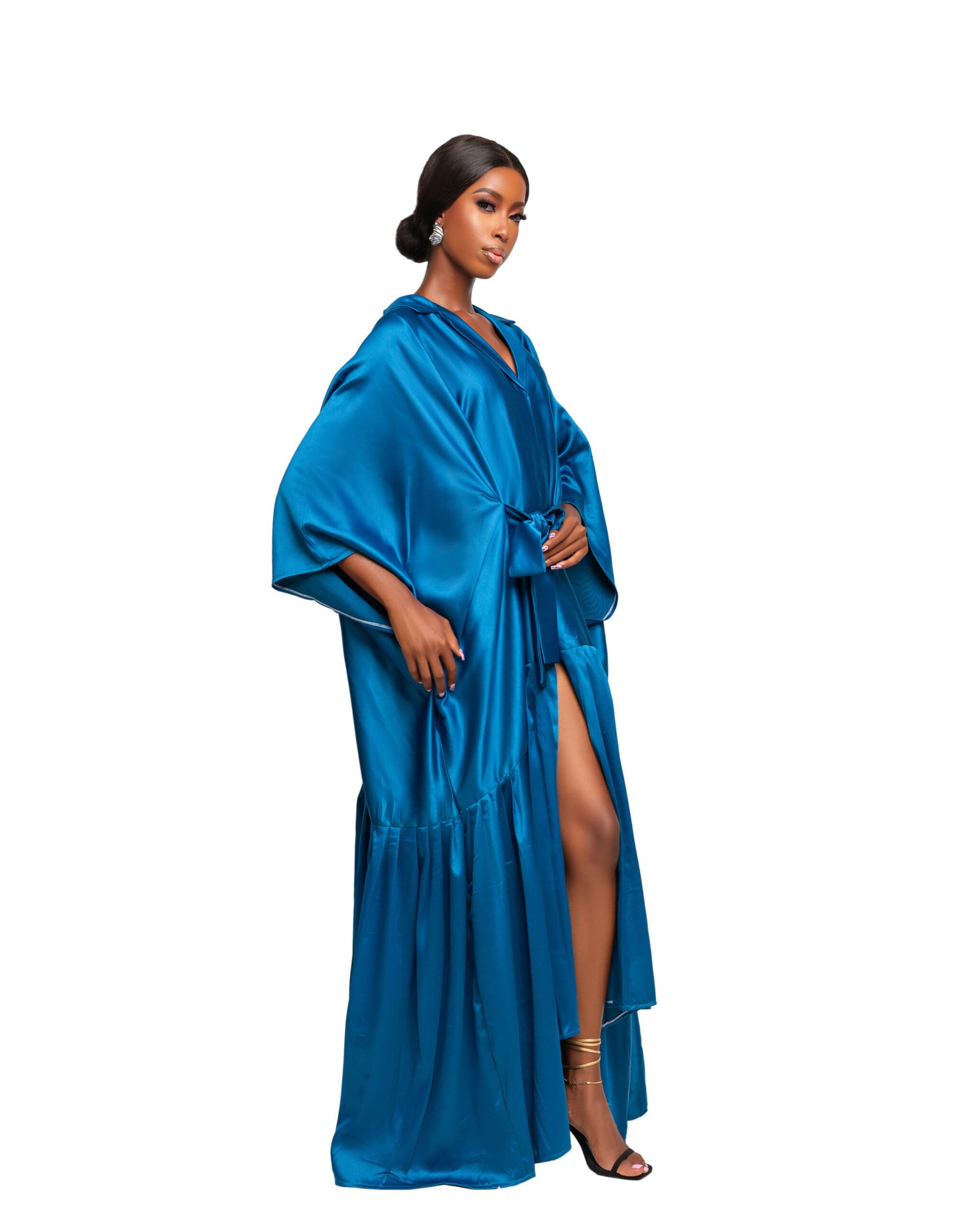 Luxe Satin Tie-Waist Kaftan in a captivating ocean blue. Crafted from smooth, high-shine satin, this elegant piece drapes effortlessly for a luxurious, flowing silhouette. The relaxed fit features wide kimono-style sleeves and a flattering V-neckline, while the adjustable tie waist cinches in to accentuate your shape. A dramatic front slit adds a bold, modern touch—perfect for making a statement at beachside events, evening parties, or resort getaways.